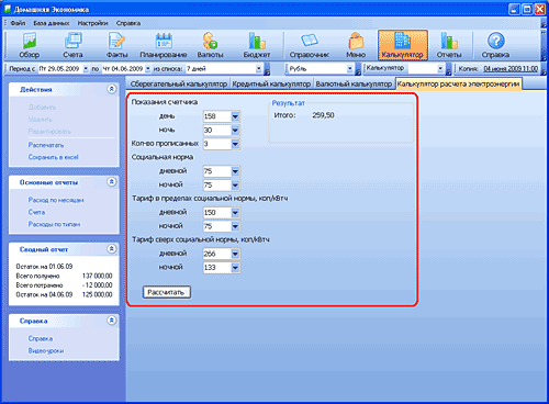 Для начала работы с ним введите исходные данные. К ним относятся дневные и ночные показания счетчика, число прописанных на жилплощади человек, социальная норма потребления, а также тариф в пределах социальной нормы и за ними. Для запуска обсчета нажмите на кнопку Рассчитать. При этом в правой части вкладки будет отображен результат работы калькулятора.